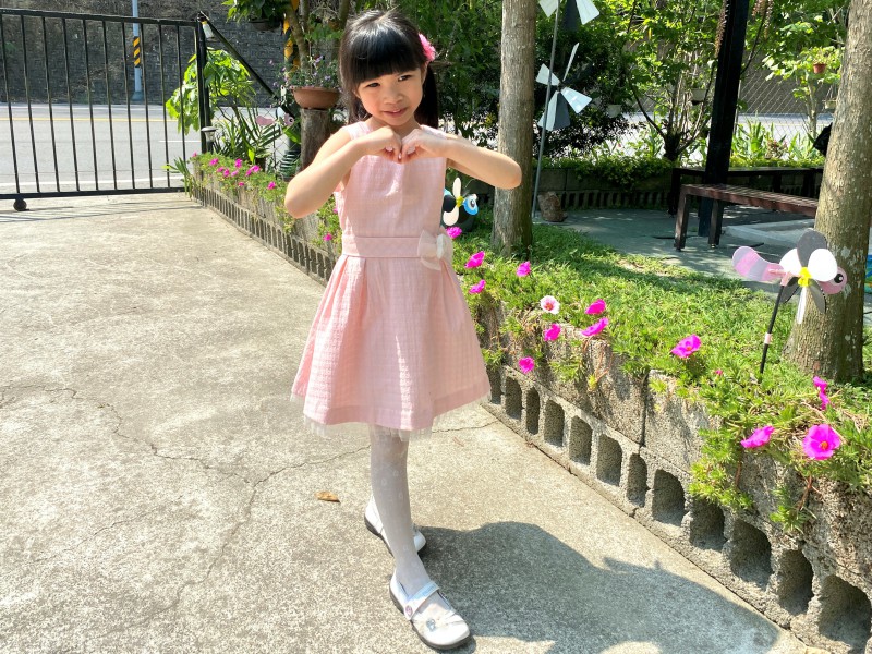 這款非常特別的顏色其實是媽媽很喜歡,加上突起的小點綴設計的很細緻,亮紗彈性很好,光線打下來紗是會透光的。剛好今天入住的飯店是古堡風,安安就像城堡裡的機靈又可愛小公主。