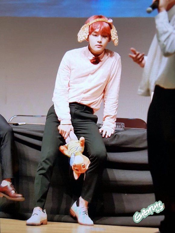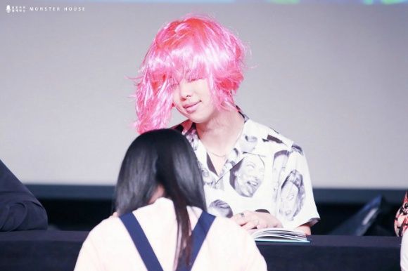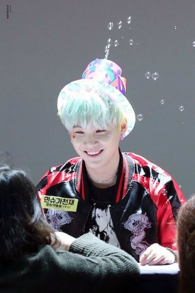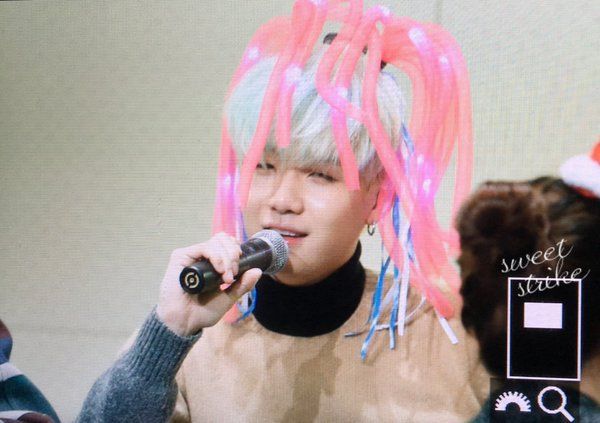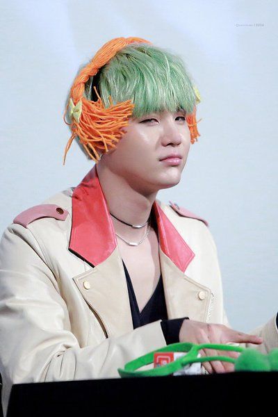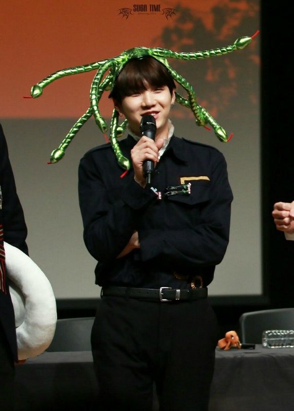 雖然是各韓團、韓星見面會最常見的「卡通頭套」,但是阿米們還是可以找到特別獵奇的,除了玩具總動員頭盔、史瑞克、熊本熊、侏羅紀恐龍之外,還硬是給SUGA戴上超甜美的紅髮安妮辮子頭套…(求他的心理陰影面積XD)