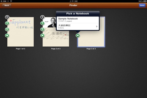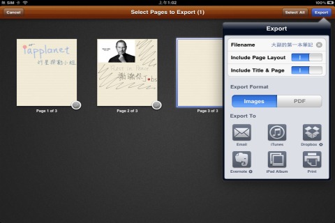 最後一個望遠鏡選項可以瀏覽整本筆記內容,按下Edit可以複製刪除整頁筆記外,還可以將內頁傳給其他筆記本,就像活動紙張一樣相當方便;此外也提供匯出的功能,選好要匯出的內頁後按下Export可以讓內頁以圖片或PDF的方式寄電子郵件或上傳到Evernote、Dropbox等雲端服務,更可以透過無線列印的方式印出筆記,讓自己做完筆記後可以輕鬆的透過不同方式做備份或轉寄
