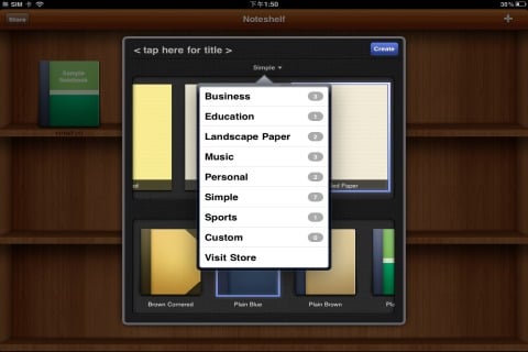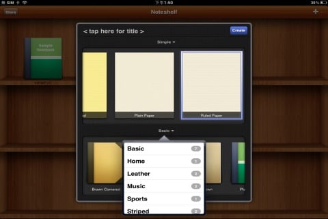 按下右上方+可以新增筆記本,在這裡多樣化的封面和內頁可供選擇。點擊下拉式選單可以看到更多的封面和不同格式的內頁,若想要更多樣化的封面和內頁可以到線上商店選購。最上面有個 <tapherefortitle>可以建立筆記本的封面標題,中文嘛ㄟ通喔!
