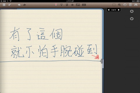 只要按下工具列右上角手掌圖案後筆記本旁會出現有點像小鐵塊般的保護裝置,箭頭指向的地方其內頁下半部都會有防寫功能,書寫時就不用擔心手腕會去碰到了