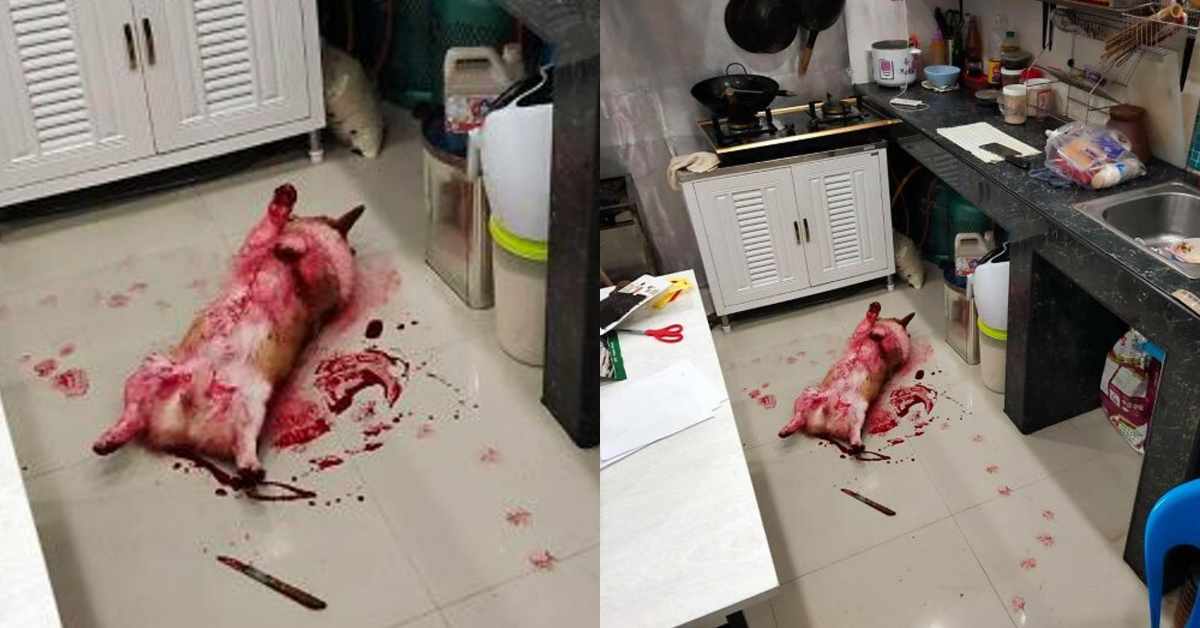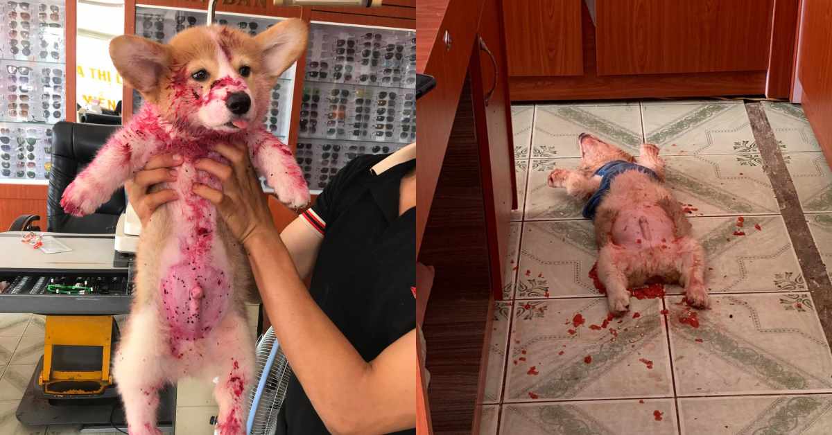 血案現場,一隻柯基犬倒臥在血泊中,畫面嚇人!媽媽仔細看後,知道柯基犬應該不是出了什麼事。因為牠身上沒有血水滲出來,而看清楚些,這紅色也不像是血。
