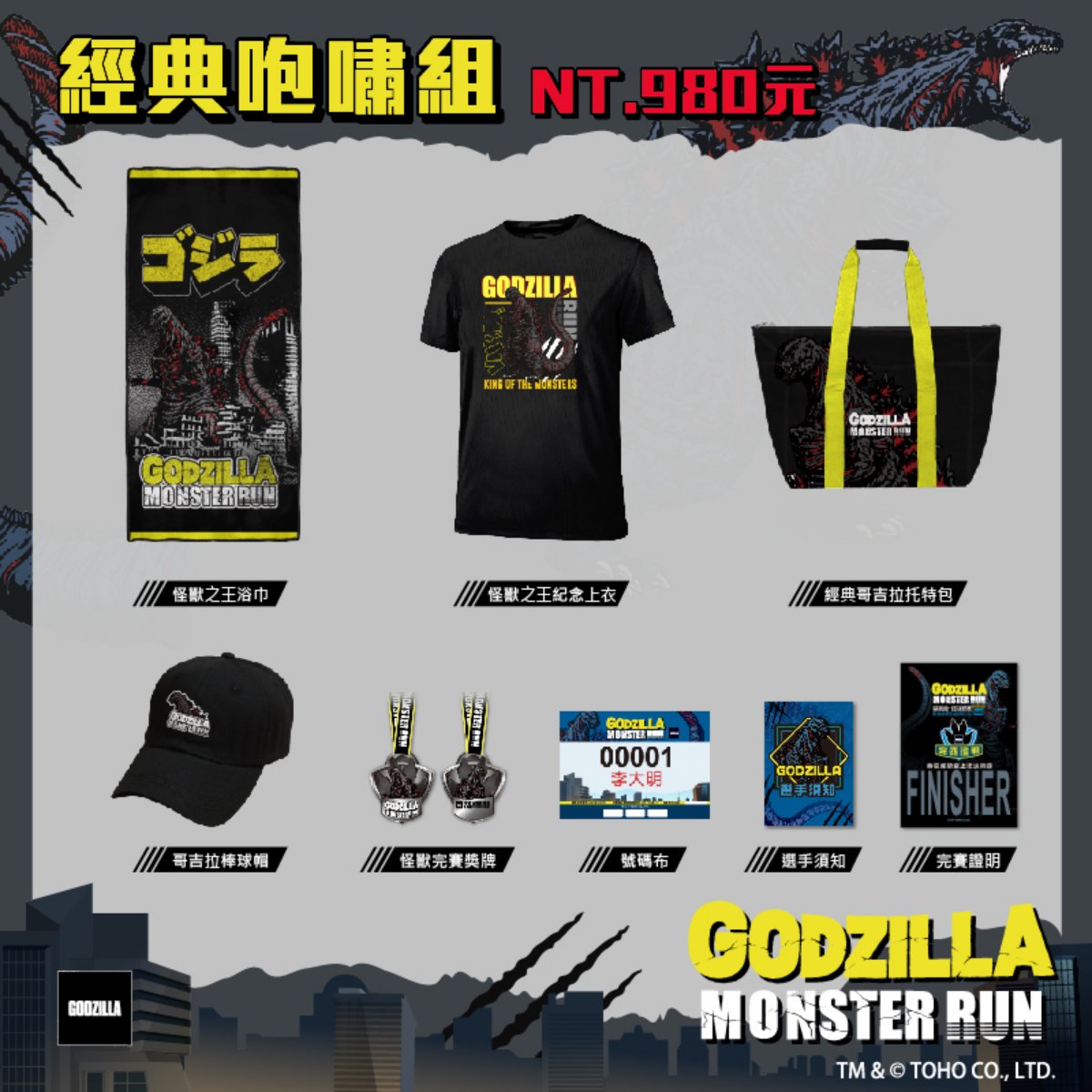 粉絲們最期待的路跑物資組別,特別分成「萌獸運動組」「經典咆嘯組」「怪獸之王組」三種組別供粉絲選擇,妞妞們可以自由挑選要Q版哥吉拉萌獸造型周邊和獎牌,或是經典哥吉拉的版本,並依照組別各別推出特色物資。