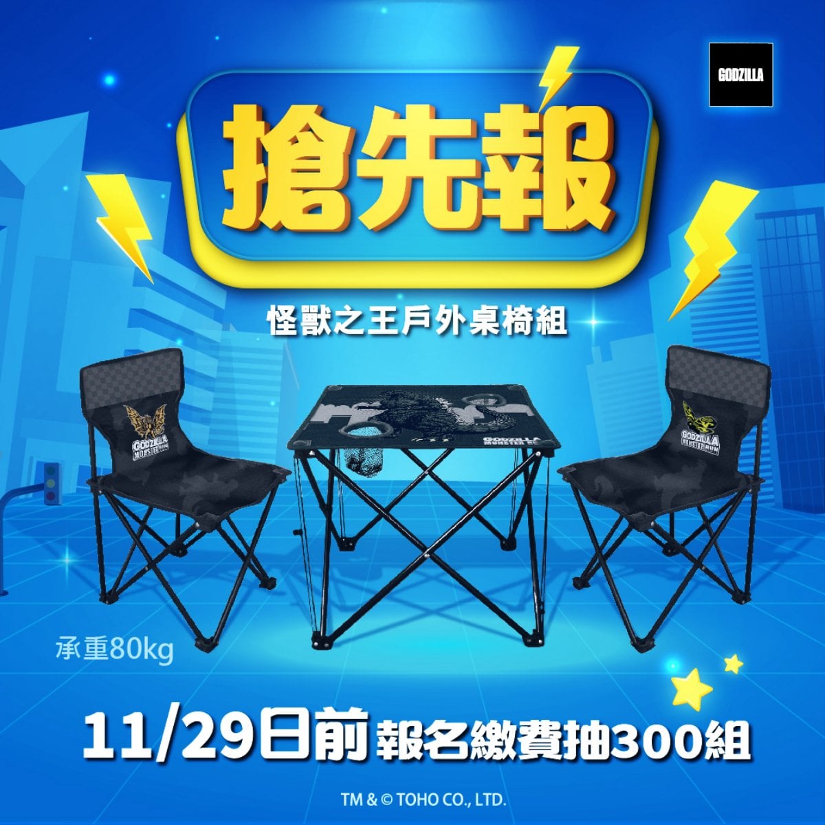 只要在11月29日前報名繳費,即可抽超豪華的「怪獸之王戶外桌椅組」!收納方便又實用,上面的印花設計採用三大王者,不單只有粉絲們喜愛的哥吉拉,還有摩斯拉和王者基多拉,完全是給哥吉拉粉絲們的福利,帶出露營絕對是全場焦點。