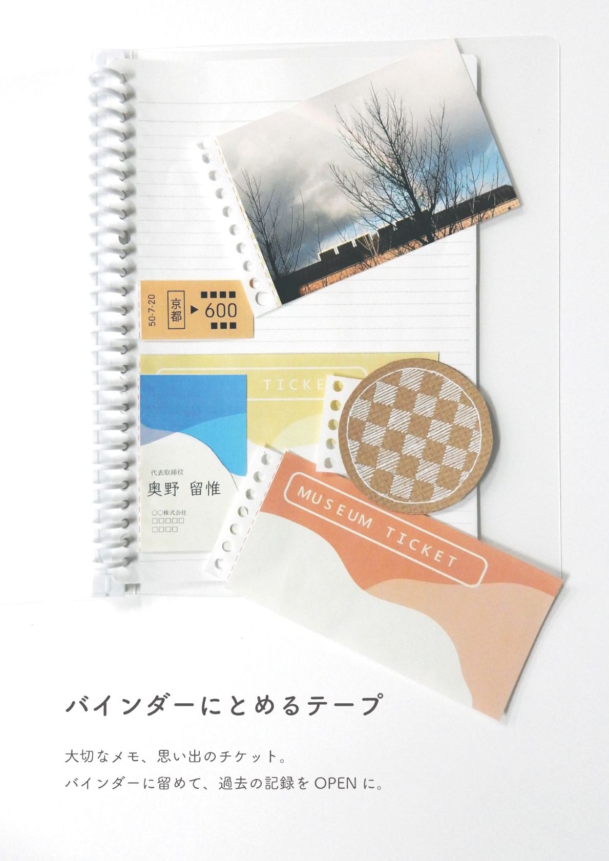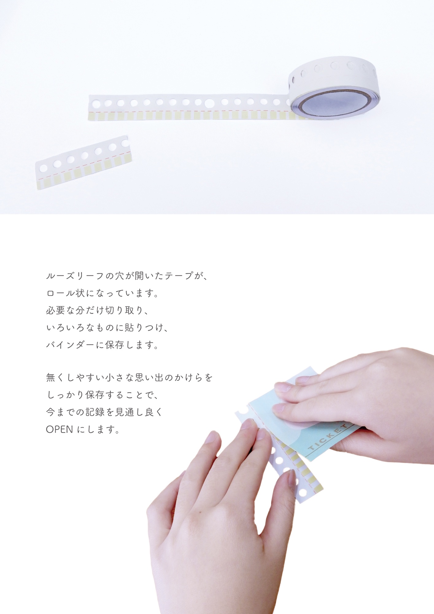 對於喜歡記錄生活的人,活頁孔膠帶應該會非常方便!不必再擔心手帳貼不下,直接撕取需要的膠帶用量,黏貼在想留下來的票根、明信片、名片等等上,就可以安心放入活頁夾裡收藏了~雖然外觀看起來很平凡,但對於想好好收藏紀念品卻又沒時間整理的人來說,很方便實用,可以說是懶人福音!若再配合簡單的文字記錄,便能夠是一本無時效性的萬用手帳了~