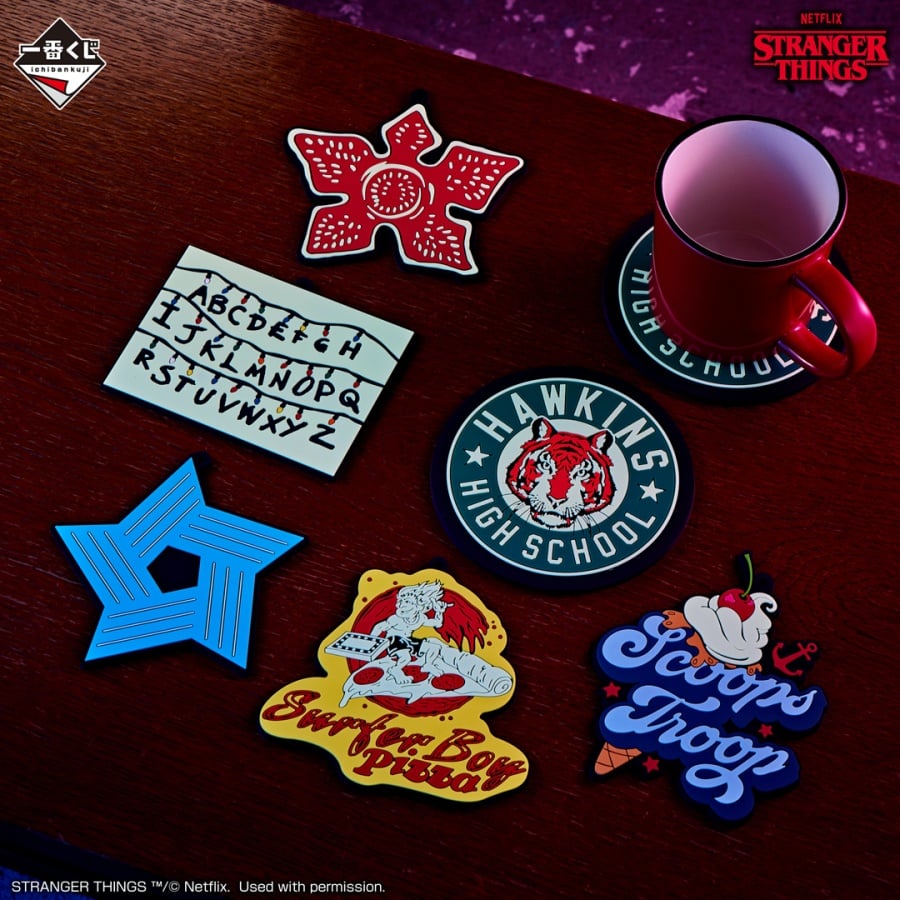 H賞的「橡膠杯墊」分別以魔神、燈泡字母牆、霍金斯高中吉祥物、Starcourt商城、Scoops Ahoy冰淇淋店、Surfer Boy披薩店為靈感呈現。除了具備螢光的材質之外,也可以掛上附帶的串鏈變身吊飾或鑰匙圈喔!