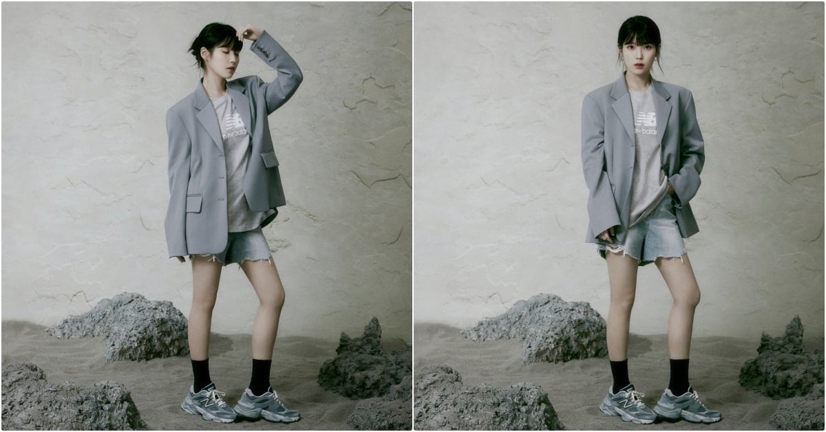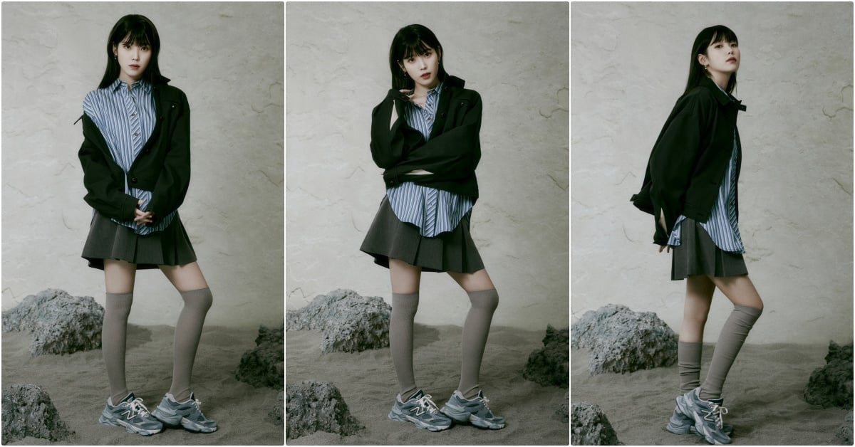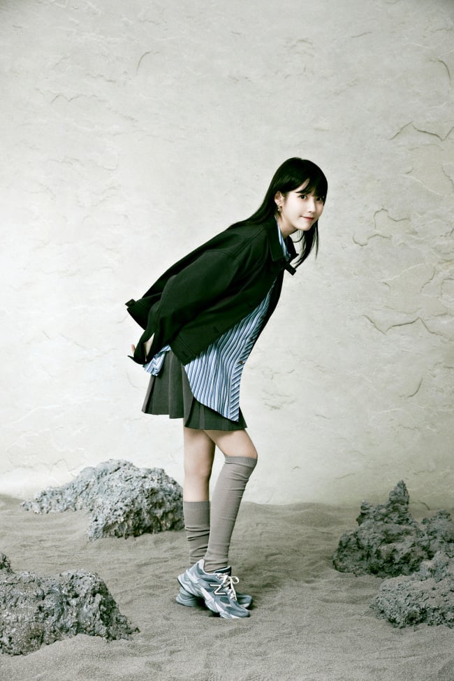 IU用OVERSIZE西外混搭牛仔短褲,會不會太時髦?另一套馬上切換成「Y2K校園美少女」,換上夾克、襯衫加上百摺短裙以及過膝襪,最後都搭上一雙灰灰藍藍的復古NB 9060,一秒拉長視覺比例,這就是小個女孩絕對要跟上御用長腿神器啊!