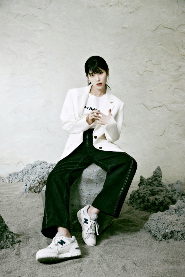 百搭的奶油白鞋身,在細節處點綴寶寶藍、迷霧灰,低調注入少女粉嫩元素,鞋側招牌N字LOGO則採用沈穩的「月夜藍」,跟IU的個性微甜造型超搭,NB550鞋型延續80 年代末的經典美式籃球鞋輪廓、加上皮革拼接網布鞋面、低筒球鞋設計,完全是甜帥女孩的標配~