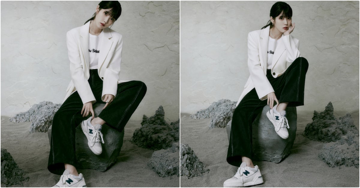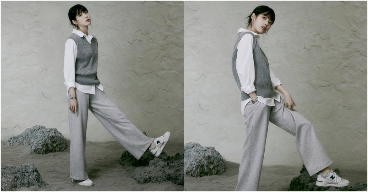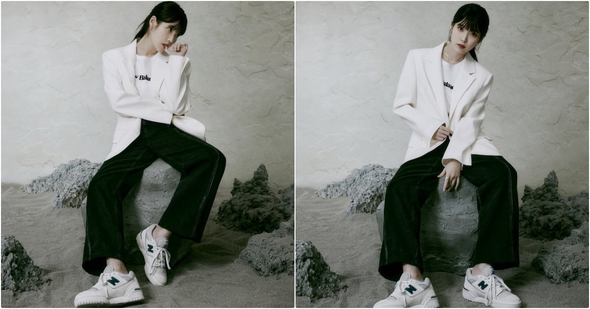 可愛黑髮妹妹頭收起、綁上俐落的低馬尾,IU換上白色西外、內搭白T加上高腰黑褲,一個眼神看向鏡頭就好殺(膝蓋軟了),另一套用基本的白襯衫、毛背心以及棉褲完成「柔和的灰色系OL穿搭」,2套造型的腳上都穿著同一雙New Balance「NB550」!