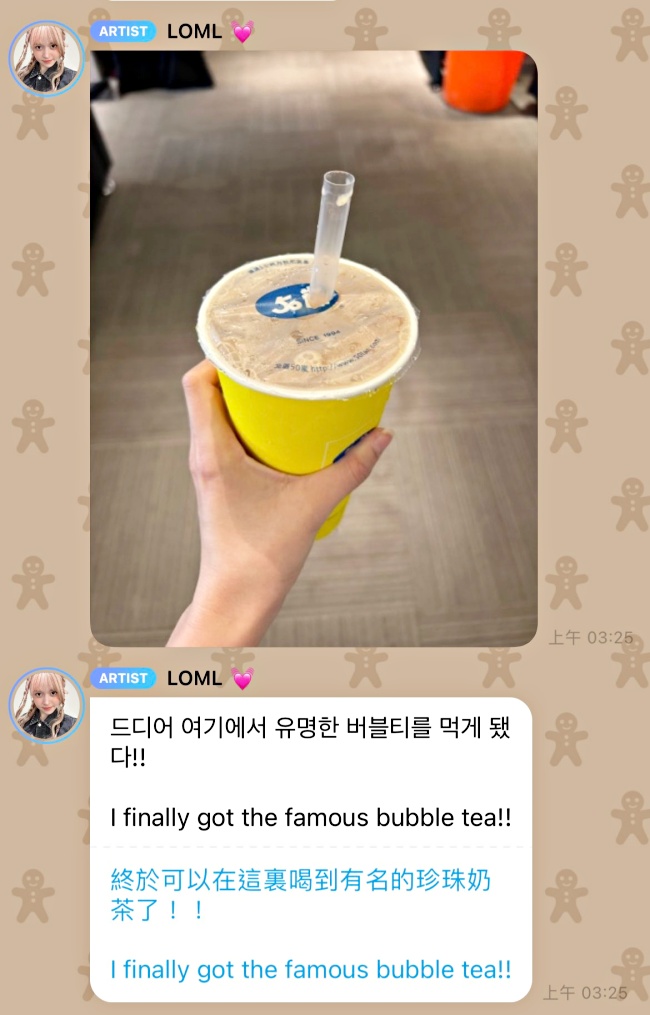 NMIXX也不時在Bubble泡泡平台分享在台動態,其中成員Lily就語氣興奮的分享一張「手搖飲圖」,宣告:「終於在這裡喝到有名的珍珠奶茶了!!」圖中熟悉的黃底、藍字包裝,就是1994年成立的老字號連鎖品牌「50嵐」!!!