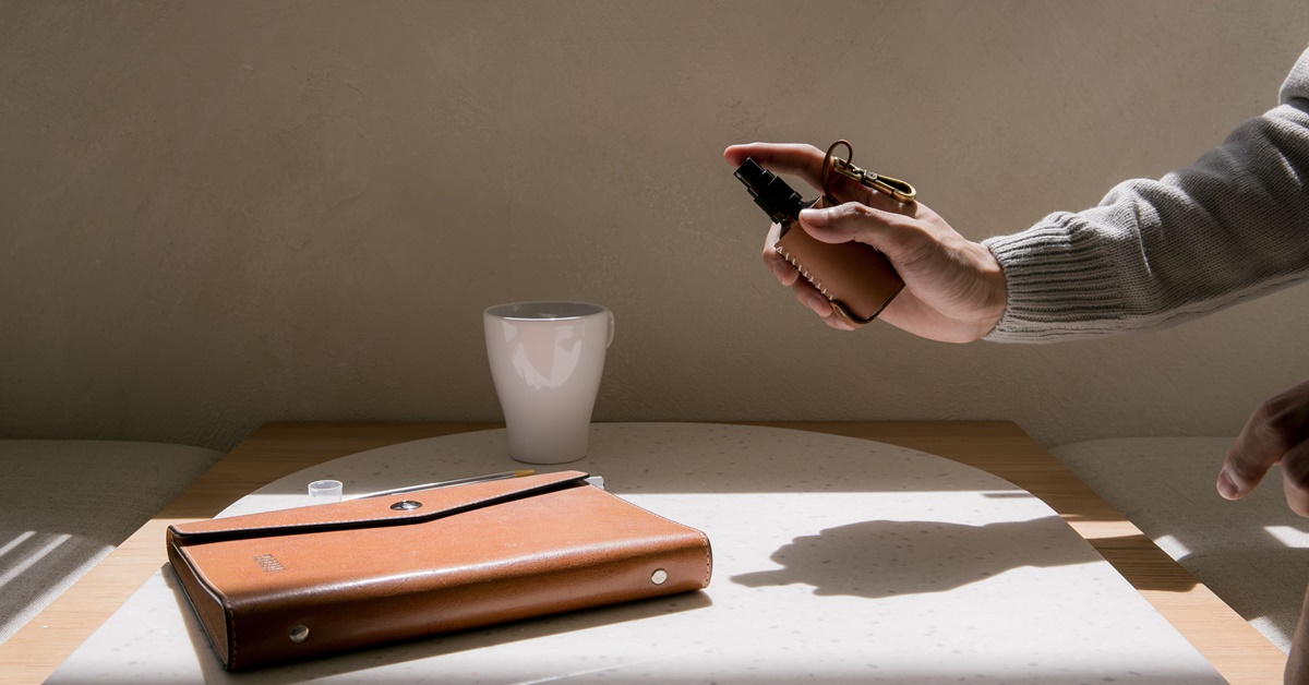 【酒精噴霧皮革收納套組】收納套組由牛皮與黃銅搭配而成,因瓶身具有弧度,採棒球縫法取代一般車縫方式來接合,使收納套更加堅韌耐用,也呼應台灣這片土地的堅韌精神。此外,內含一只茶色噴霧瓶,讓隨身攜帶酒精噴霧以及消毒的舉止,也能優雅有品味。噴霧瓶除了酒精,也能作為香水瓶,可掛於包包上攜帶。
