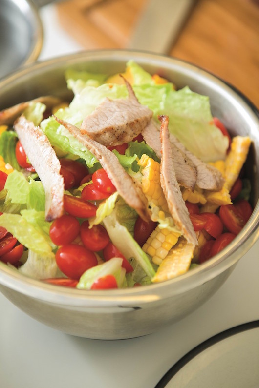 先以鹽巴與胡椒灑上松阪豬,略按摩後醃漬約10分鐘備用。將蘿蔓萵苣清洗過後擦乾水分、剝皮後放入冰箱冰鎮。將蕃茄、小黃瓜洗好擦乾,對切備用。切下即時甜玉米的玉米粒備用。準備一紙炙燒烙印平底鍋,大火熱油將松阪豬煎上色,直到表面油脂浮出即可關火,再將豬肉放入200℃的烤箱,烤10~15分鐘。把所有蔬果放入沙拉碗,並將豬肉從烤箱取出、切片擺入碗中。待食用時,再淋上日本敘苑瓶裝生菜沙拉醬即可。