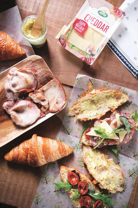 適量由將台灣正黑豬柴窯煙燻里肌煎到表面微焦香備用,並將可頌麵包剖半後放乳烤箱烘烤出香氣,最後將一半麵包抹適量蒜味美乃滋後,依序放上綜合葉菜、油漬番茄、柴窯煙燻里肌、切達起司,再將另一半抹上蒜味美乃滋蓋上即可。