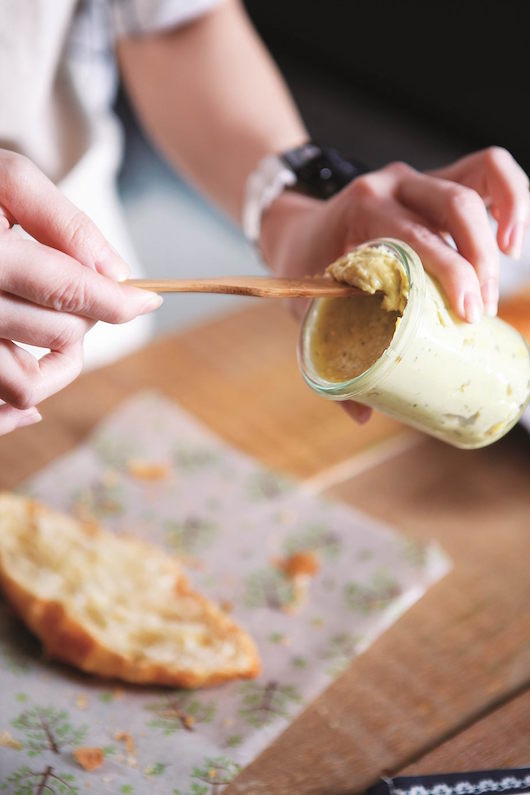 將蛋黃、海鹽、洋香菜通通放入鋼盆中打到轉白。再將橄欖油少量加入(一開始約3、4滴),用電動攪拌器打到油脂完全乳化後,再加入橄欖油攪打,直到完全加完為止。最後再將蒜泥及檸檬汁、蜂蜜倒入拌勻,用密封罐裝好放入冷藏保存備用。