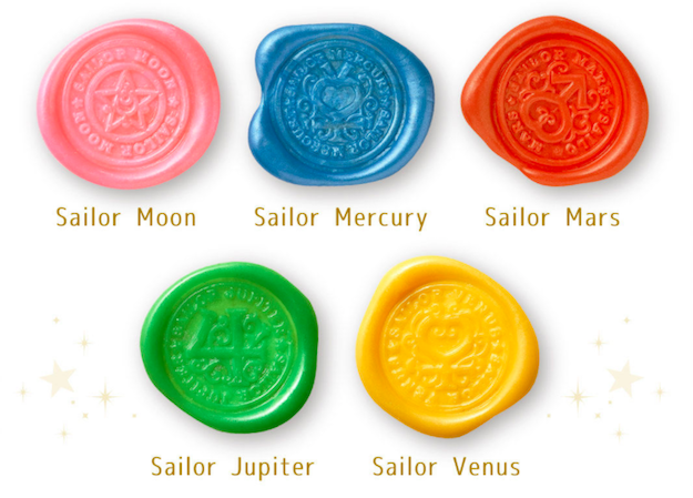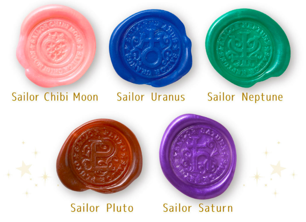 每款火漆蠟與封蠟章所採用的顏色與圖案,都與該名戰士有關。不過粉紅色的月光仙子款比較特別,上面的圖案是以R代變身器的輪廓來取代月亮符號。