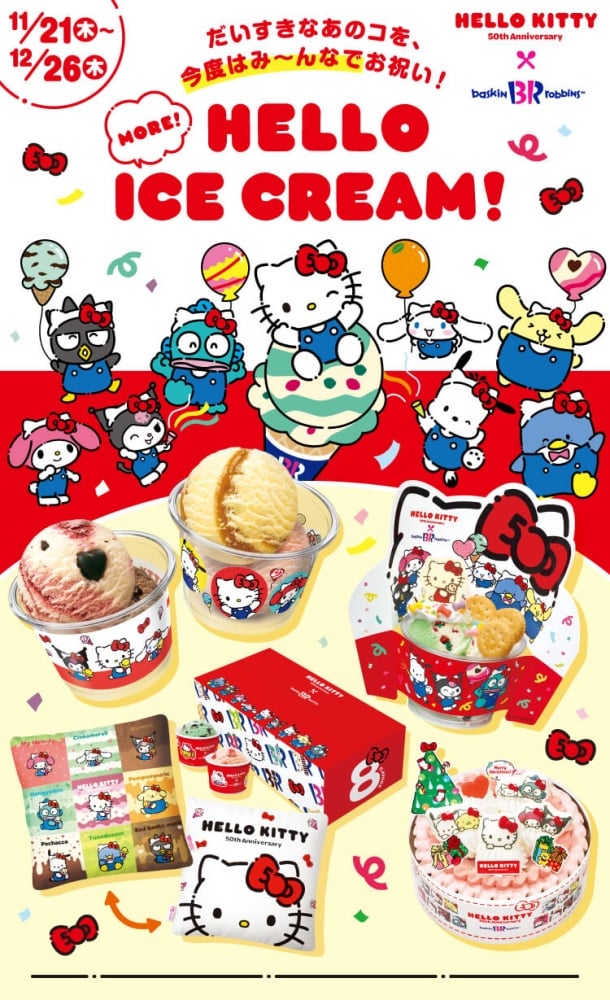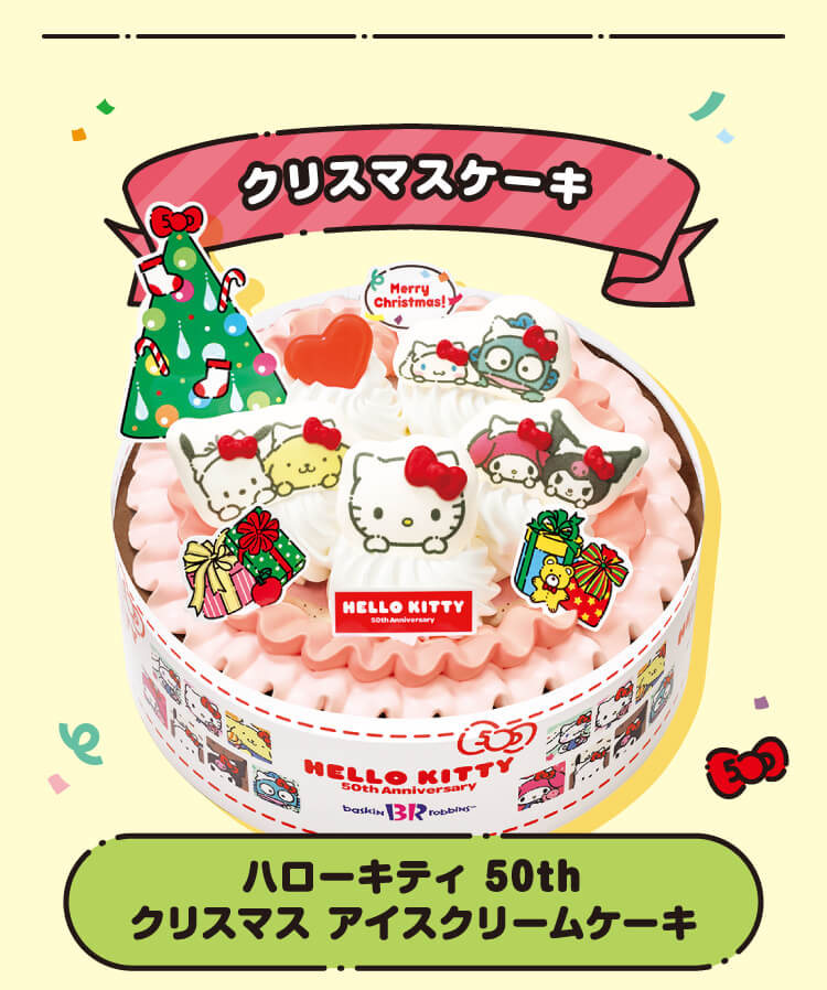 配合聖誕節的到來,日本31冰淇淋夢幻打造 Hello Kitty 50週年的聖誕冰淇淋蛋糕,讓身為主角的 Kitty 被三麗鷗角色們團團包圍。蛋糕以「Very Berry Strawberry」、「Chocolate Chip」、「Chocolate」三種口味為基底,並擠滿了草莓口味的粉色荷葉邊奶油擠花。