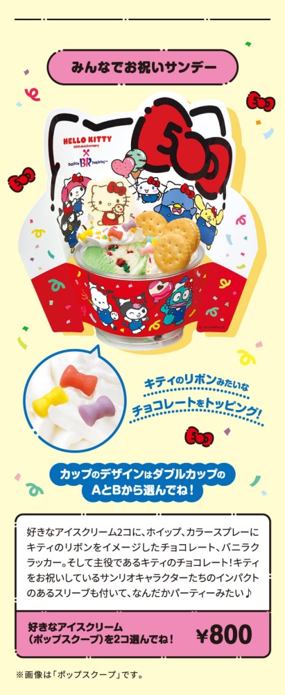 採用三麗鷗角色全員為 Hello Kitty 慶祝的形象來構思的冰淇淋聖代,搶眼的 Kitty 造型杯套上,聚集了美樂蒂、大耳狗、酷洛米、人魚漢頓、布丁狗、帕恰狗、山姆企鵝、酷企鵝。而在聖代上頭則有 Hello Kitty 巧克力、鮮奶油、餅乾,以及五彩繽紛的迷你緞帶巧克力。