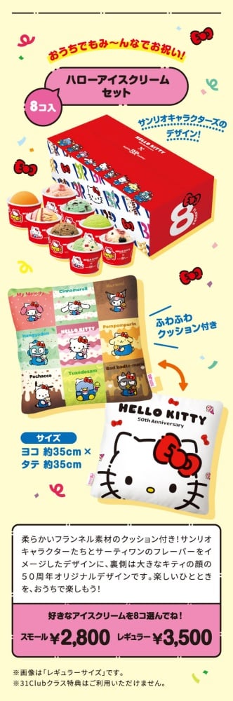 日本31冰淇淋本次祭出的冰淇淋套裝,內含8種可自選的冰淇淋口味。外盒包裝及冰淇淋杯子,都充滿著 Hello Kitty 經典的配色及圖樣,而三麗鷗角色們也都驚喜躍上包裝盒。同時,冰淇淋套裝也附贈了法蘭絨材質的抱枕。除印有31冰淇淋和三麗鷗的原創設計,還能看見 Hello Kitty 可愛的大臉。