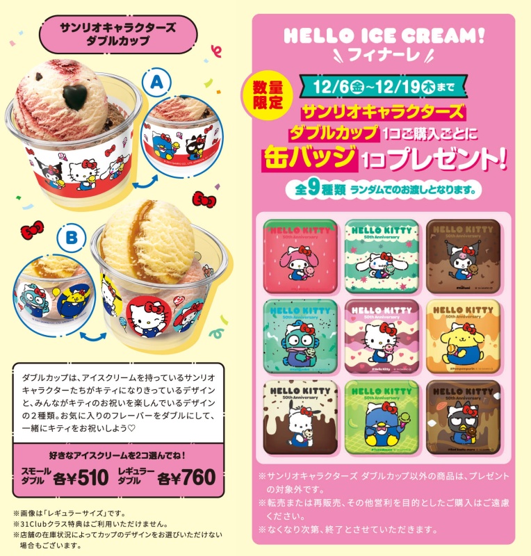 第二彈登場的三麗鷗角色雙球杯,共推出了兩種類的全新杯裝。集合 Hello Kitty、美樂蒂、大耳狗、酷洛米、人魚漢頓、布丁狗、帕恰狗、山姆企鵝、酷企鵝,無論是俏皮圓點,或是手拿冰淇凌甜筒的圖案款式,都萌到不行。只要購買雙球杯還可以獲得隨機的三麗鷗角色徽章。