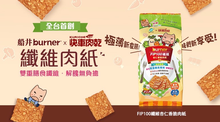 新年迎春時刻,怎能少了既傳統又創新的年味零嘴?肉乾界霸主「快車肉乾」聯手保健食品界龍頭「船井生醫」推出全新「FIP100纖維杏仁香脆肉紙」!選用快車肉乾三十餘年醬油秘方以及美國加州杏仁,承襲肉紙的薄脆鮮香,還加入船井暢銷健康食品「FIP100纖維粉」獨家雙重膳食纖維,讓零嘴美味更健康,顛覆你的肉紙印象!即日起船井生醫購物網就買的到,每包售價69元,年節送禮與自用都合適;農曆年後在快車肉乾的門市、官網、百貨專櫃、蝦皮通路也買的到!