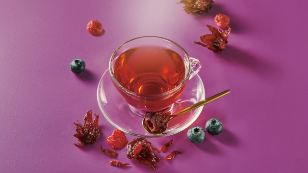 無咖啡因的「洛神野莓茶」,以洛神花為茶飲基底,搭配橘皮、蘋果、草莓、覆盆莓等,與酸潤的洛神花茶湯相互印襯,入口柔和滑順。