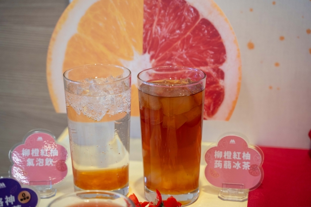 以台南柳丁為基底的「柳橙紅柚蒟蒻冰茶」,加入熱門紅茶及葡萄柚果肉,並搭配Q彈蒟蒻增添口感,咀嚼控要喝。喜歡氣泡口感的則可選擇「柳橙紅柚氣泡飲」以汽水取代紅茶做為飲料基底,選用台灣柳橙與紅柚調和製成,入口清爽。