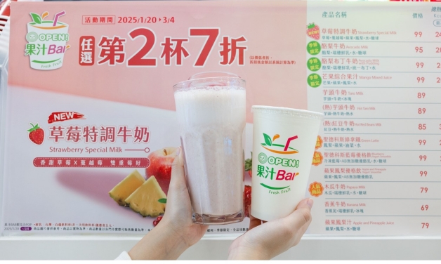 另,實體門市「果汁Bar」於即日起,也將販售以在地草莓和蔓越莓、鳳梨、蘋果等水果調製的「草莓特調牛奶」口感層次綿密、酸甜過癮即日起至2月25日還有果汁Bar全品項第二杯7折優惠!