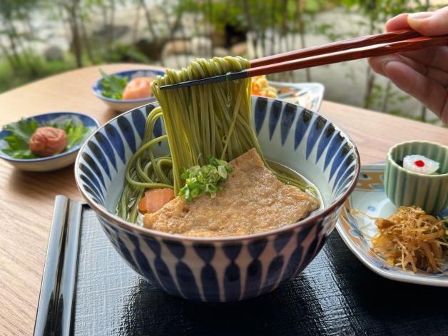 好評不斷!「自家製豆皮抹茶溫麵」使用日本茶中香氣濃厚的「雁音焙茶」與「利尻昆布」熬煮製成的美味豆皮,再搭配宇治抹茶麵製成「溫湯麵」。提供葷食者「京都柴魚風味高湯」、素食者「柚子昆布的高湯」,兩種湯底各有風味,清淡又富有甘味,溫潤到讓人直接喝到見底,也可加調味料七味粉,幸福度滿分! (3月4日起販售)