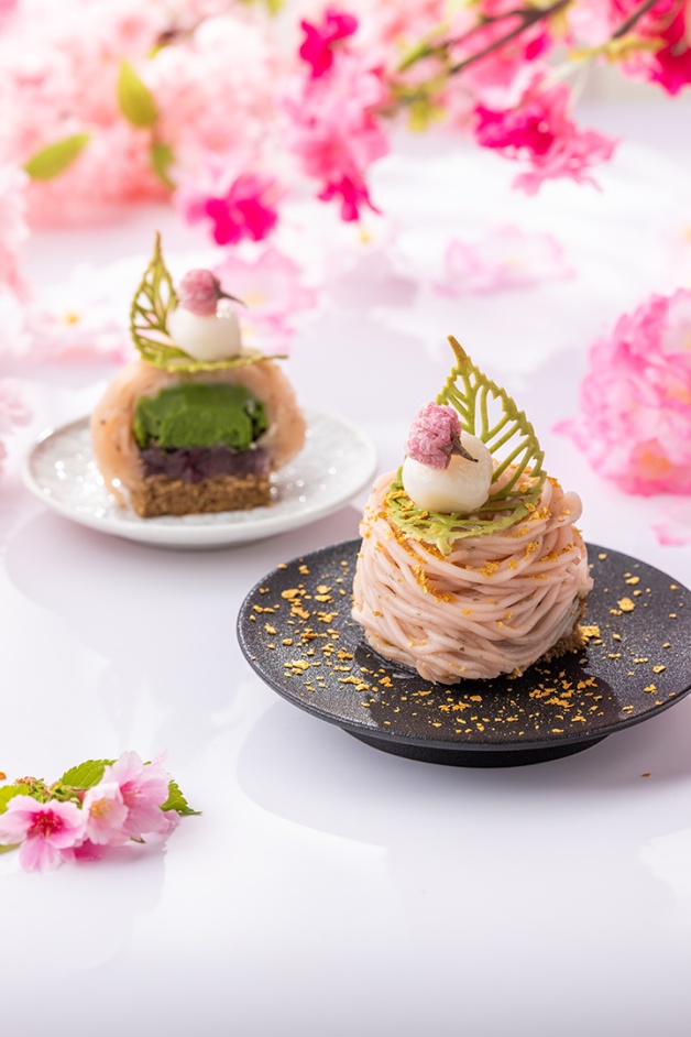 喜歡蒙布朗的妞妞們千萬別錯過!「櫻花蒙布朗」以焙茶海綿蛋糕為底,依序疊上紅豆內餡、抹茶豆沙餡、抹茶慕斯,最後製作「櫻花沙織」,上方擺上抹茶櫻花葉餅乾、白玉、鹽漬櫻花,最後以金箔脆片點綴增添貴氣。不同口感堆疊,不僅有櫻花鹹味、抹茶香氣、綿密紅豆泥、焙茶蛋糕口,更呈現出猶如櫻花粉色視覺饗宴!(3月4日起販售至4月底)