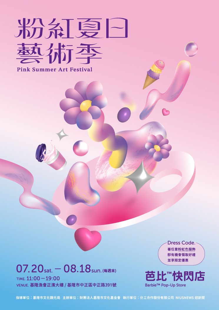 今年夏天,財團法人基隆市文化基金會為漁會正濱大樓帶來嶄新的樣貌與風格體驗,7月20日(六)至8月18日(日)連續五個週末舉辦期間限定的粉紅夏日藝術季,粉紅夢境打卡小屋、藝術展覽、芭比快閃限定店、名店美食市集、⋯⋯好看、好玩、好吃都在粉紅夏日藝術季!民眾著粉紅服飾更可享有限定小禮及優惠,是今年最不可錯過的話題活動!