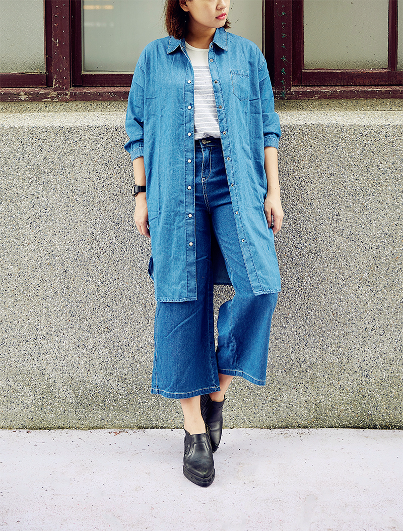 嬌小女孩可以把長版丹寧襯衫直接當洋裝使用,其他身型的女孩可以拿來做為外搭,除了具有防曬作用之外,還能修飾身材、增添搭配豐富度,都是十分實用的穿搭方式呢!內搭使用休閒感十足的條紋上衣,搭配輕量寬版丹寧,完成好感度極高的Look!