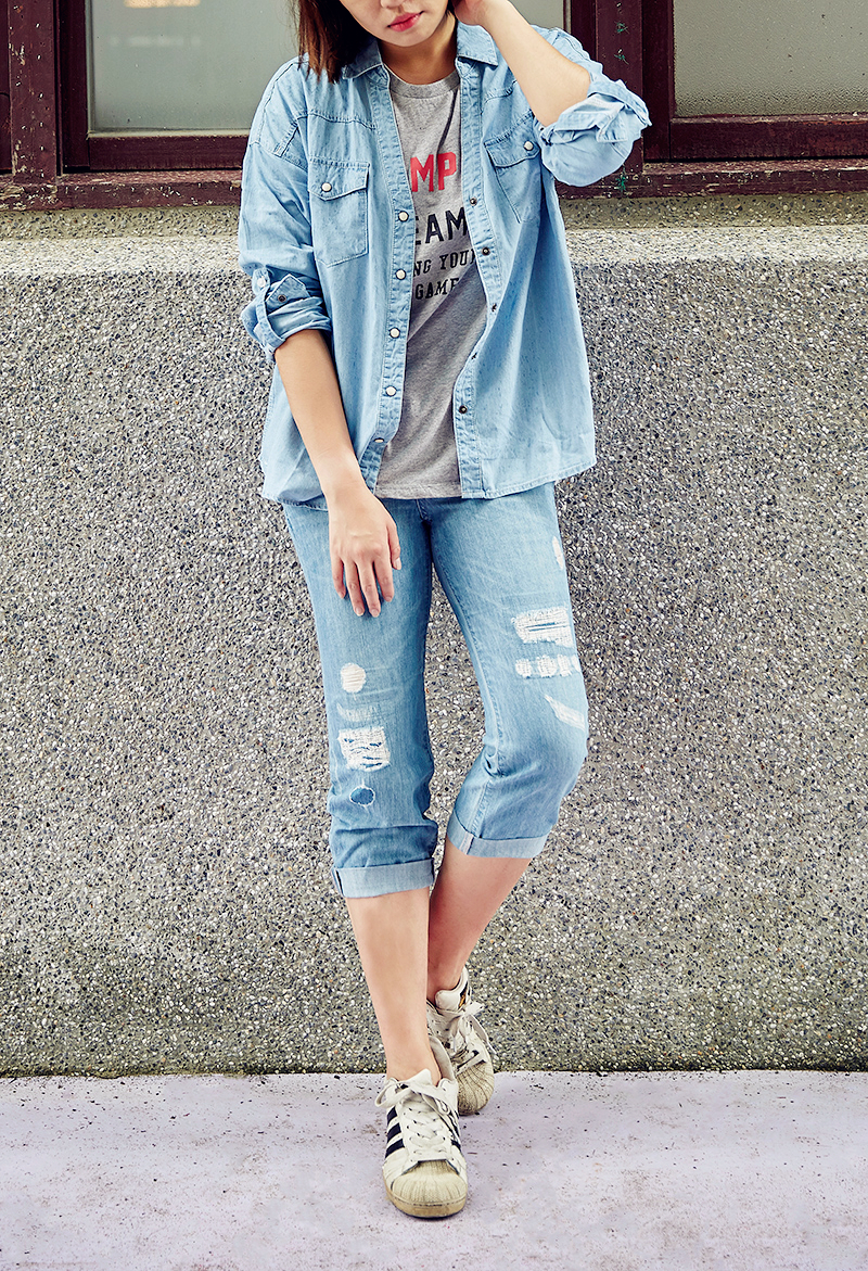 用淺色系來統一全身穿搭,完成舒適又俏皮的模樣。內搭字母設計T恤,在外搭開襟設計丹寧襯衫,組合成任何場合都實用的Look。想要製造男孩感,可以選擇刷破設計的丹寧七分褲,帶出無拘無束的自在氛圍,呈現讓大家都想親近的風格唷!
