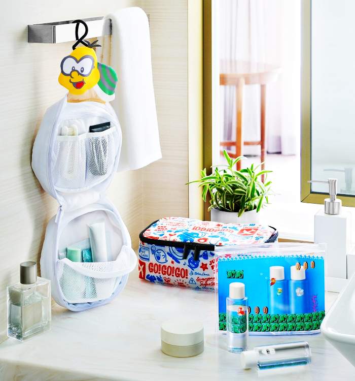 球蓋姆造型儲物袋(圖片中的左邊)裡面有兩層空間可放洗漱用品,並設計了網狀隔層,可以將物品分類收納,不怕物品亂跑!另外,球蓋姆的頭上還裝有掛鉤,可以像圖片一樣掛在浴室使用。除了儲物袋,還有夾鏈袋&迷你瓶組(圖片中的右邊),可以用來裝個人的盥洗用品或卸妝用品。