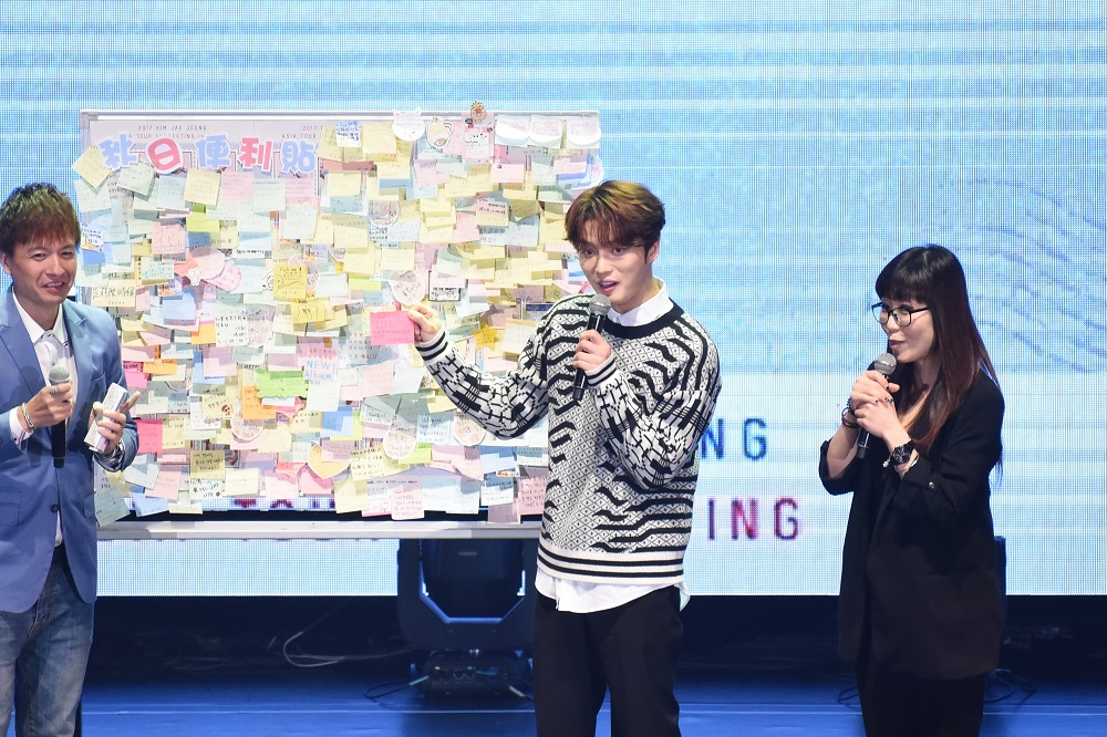 這次見面會的活動主持人是小鐘,現場一開始氣氛便頗為歡樂。金在中出場後立刻先用中文向大家問好,而在活動開場的「便利貼環節」,有粉絲發問「什麼時候歐巴要把我娶回家?」讓在中害羞表示目前沒有結婚打算,但也稱讚台灣粉絲都特別漂亮。