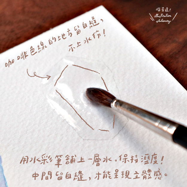 用水彩筆鋪上水分,以利後續的暈染,記得要保持濕度才能順利暈染呦!在圖案中間留下白縫,不上水分(如圖中咖啡色線條部分),這樣上色後才能呈現琥珀糖的立體感。