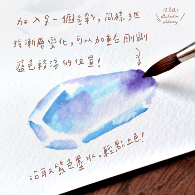 加入第二個顏色,用紫色輕點上色,記得同樣保持由淺至深的漸層,可以在剛剛藍色較淺的部位加重色彩。