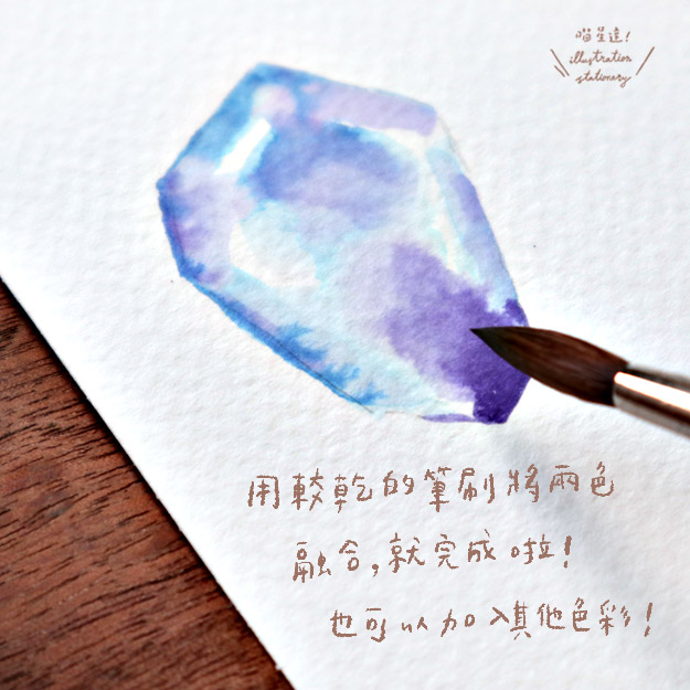 此時可以將筆刷稍微擦乾,用輕輕畫圓的方式,把兩色融合起來,繽紛的琥珀糖就完成啦!