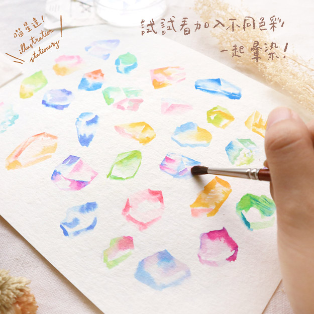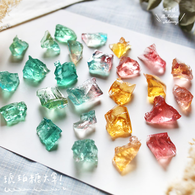 大家有吃過琥珀糖嗎?繽紛可愛的琥珀糖好像寶石一樣,散發透亮的光芒!仔細觀察琥珀糖的外型,帶點不規則的幾何形狀,色彩是柔和的漸層變化,很適合用水彩或彩色墨水繪製呢!和大家分享之前做過的琥珀糖外型,今天我們就來暈染繽紛透亮的琥珀糖吧!