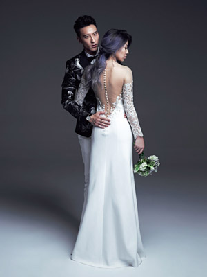 蔡詩芸對婚紗有個迷信,就是婚禮前絕對不能讓對方看到白紗。這次為了ELLE WEDDING封面拍攝,她破例穿上為婚宴準備的第二套晚宴婚紗(當天會是同款藍色),是她從INSTAGRAM上找來的澳洲設計師Paolo Sebastian,以SKYPE的方式線上討論量身,打造出符合蔡詩芸心目中的婚紗—細緻性感、摩登大膽。一穿上這件婚紗,若隱若現的身材,就讓王陽明直呼:「So sexy!」王陽明不斷套話,想要知道儀式白紗到底長什麼樣子,但是蔡詩芸就是絕口不提。不過知道蔡詩芸有兩套婚紗,他也樂得準備兩套西裝。「她要Sexy我也要穿很帥,不可以輸!因為我們是旗鼓相當的Power Couple!」