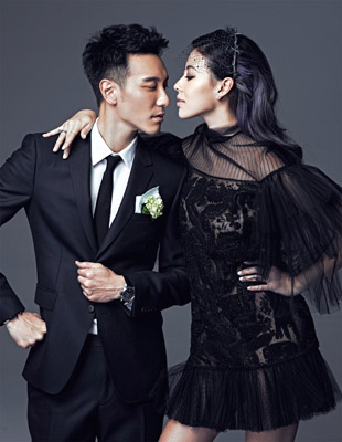 男:黑色西裝外套、黑色西裝褲、白色襯衫、黑色領結(ALL BY GIVENCHY);黑色漆皮鞋(CHRISTIAN LOUBOUTIN);CT60計時碼錶、MILGRAIN鉑金婚戒(BOTH BY TIFFANY&CO.)。