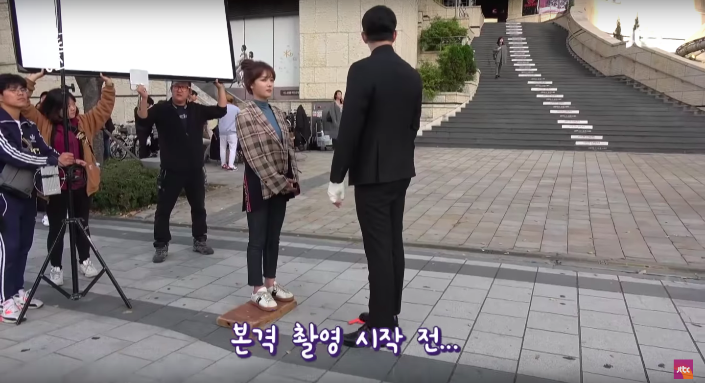 但其實這場吻戲的拍攝過程又辛苦(?)又爆笑!在前天釋出的拍攝花絮中,赤裸裸揭露這最萌身高差其實得靠道具以及姿勢努力達成(笑),畫面中的對戲畫面,金裕貞其實都得踩著「小木箱」上場~