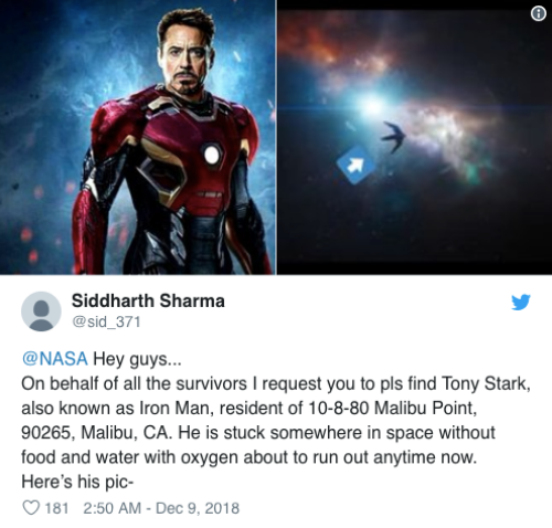 推特網友Siddharth Sharma表示:「嘿~NASA的大家⋯⋯身為地球上一半的倖存者(沒錯,在看文章的你們與妞編輯都逃過薩諾斯彈手指的幸運倖存者),請你幫我一個忙快去找到Tony Stark,也就是鋼鐵人,居住在加州馬里布,他被困在外太空的某個地方沒有食物和水,而且氧氣即將耗盡!照片在此~」