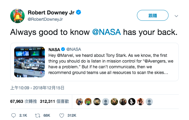 在收到NASA的協助推特之後,飾演鋼鐵人的小勞勃道尼也轉發文表示知道背後有NASA撐腰實在太棒惹,而NASA也立刻回覆「我們不容許失敗」,畢竟要看到鋼鐵人領便當實在太心痛惹(哭)