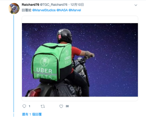 還有網友異想天開的想直接幫鋼鐵人叫UBER EATS,而且標注了NASA以及MARVEL,這是要說你們都別動讓哥來的意思嗎?
