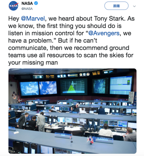 讓人驚喜的是NASA居然直接回應各界網友的請願,直接在推特發文並且標記MARVEL「嘿~MARVEL,我們聽說東尼史塔克的事了,依我們的看法第一件事就是在任務控制中心等待『復仇者們,我有麻煩了!』的求救信號,但如果他無法聯繫溝通,那我們建議地面控制中心運用所有可能的資源,地毯式搜索整個天空」