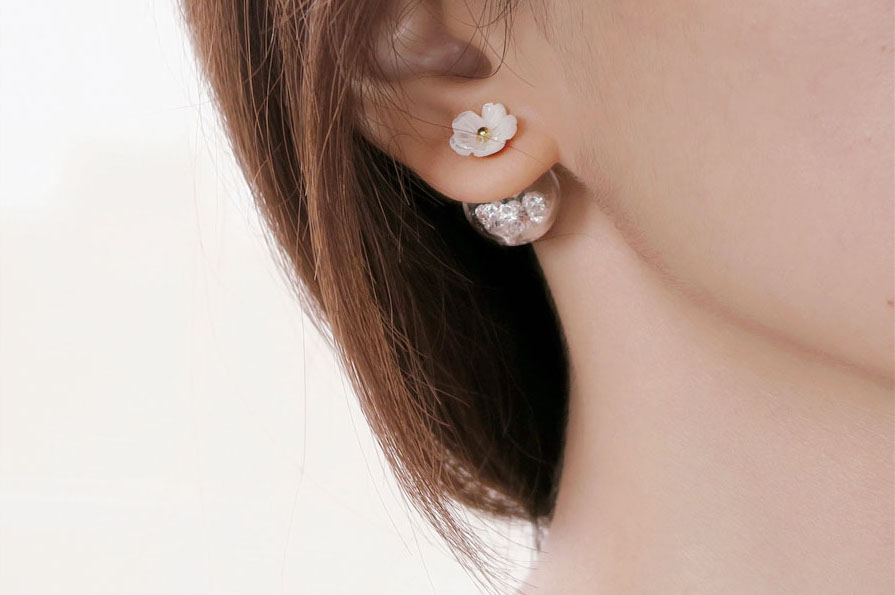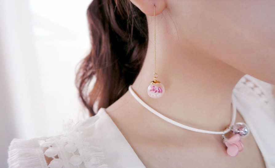 除了上面那種玻璃球延伸出來的款式之外,玻璃球在耳垂後的款式則有比較低調的美。重點在於不能挑選過大的玻璃球,如果太大會顯得突兀,像這樣的中等大小剛剛好,在耳垂後曖曖內含光,配上小花可愛又迷人。