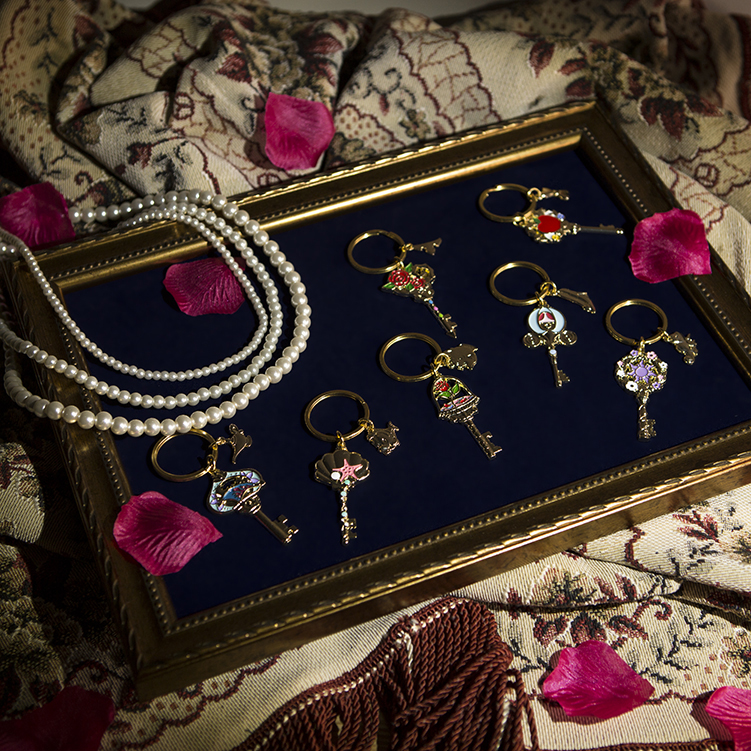 以迪士尼的七位公主為靈感設計的雕花鑰匙圈,每支鑰匙的造型都很特別,做工也非常精緻。