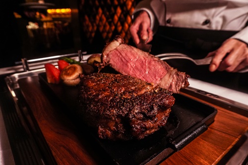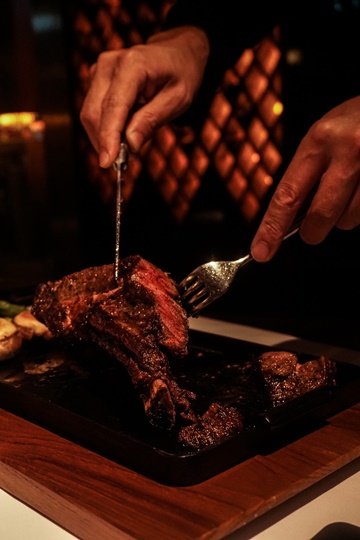 安格斯黑牛,選用大塊的帶骨肋眼先以濕式熟成的方式保存,拍上薄鹽及胡椒後煎至焦香封汁,放入蒸烤箱裡慢火焙烤。上桌前靜置十分鐘讓牛排呼吸。現場由廚師將牛排推至桌邊,沿著紋理為你一刀一刀片出完美體驗。到底這塊牛排吃什麼呢?你也可以成為專業饕客: