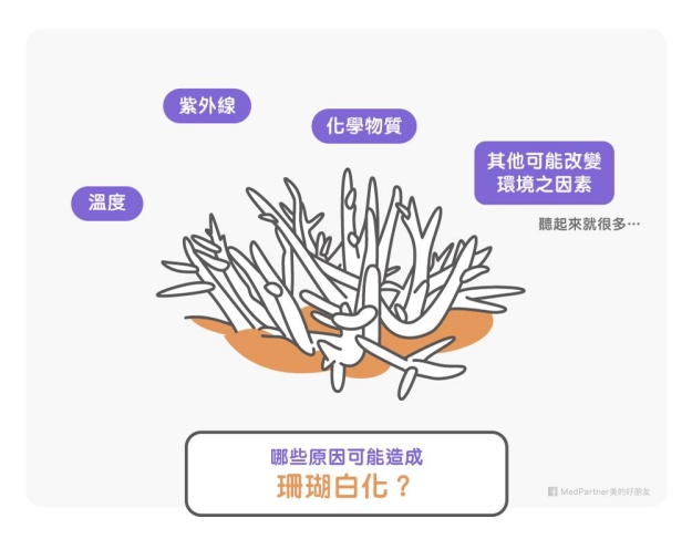 珊瑚的生長和溫度、紫外線、化學物質以及其他任何改變環境的因素都可能有關。單獨只有珊瑚是沒辦法存活的,珊瑚需要依靠它的「共生藻」,把太陽能轉化成可儲存的能量供珊瑚使用,並吸收珊瑚的含氮廢物,把它轉換成可利用的養分。珊瑚跟共生藻就是一組命運共同體,缺一不可,但因為篇幅關係,有關珊瑚與共生藻我們只能介紹到這,有興趣的朋友可以去閱讀科技部的這篇文章。