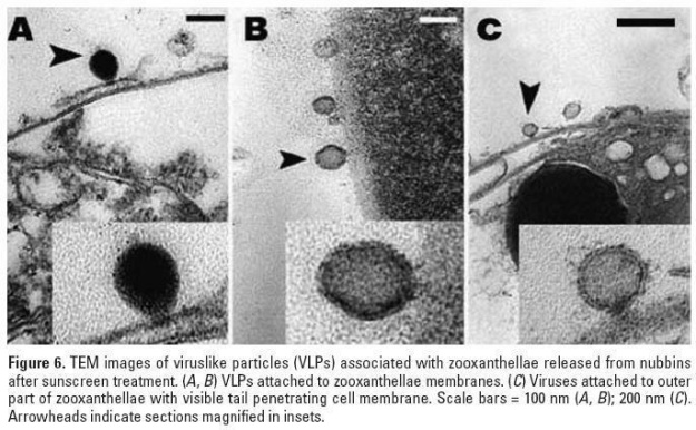 而 2008 年一篇有關珊瑚的研究指出 (1) ,有些防曬劑會引發珊瑚共生藻周圍或體內細胞病毒的大量複製,造成共生藻感染病毒死亡。死亡的共生藻會從珊瑚組織釋放,我們從外觀看就像一團混濁液體從珊瑚冒出。沒有共生藻的珊瑚,會變得非常虛弱,然後漸漸白化,進而死亡。